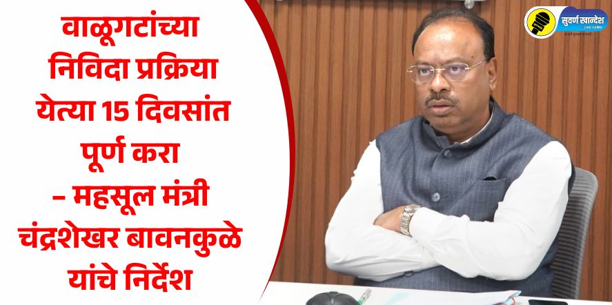 मुंबई, 15 ऑक्टोबर : एप्रिल महिन्यात जाहीर झालेल्या वाळू धोरणाच्या आधारे येत्या 15 दिवसात राज्यातील सर्व वाळूगटांच्या निविदा प्रक्रिया पूर्ण कराव्यात, असे निर्देश महसूल मंत्री चंद्रशेखर बावनकुळे यांनी जिल्हाधिकाऱ्यांनी दिले.