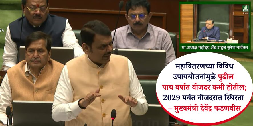 मुंबई, 18 मार्च: महाराष्ट्र महावितरण कंपनीने १ लाख कोटी रुपयांचा वर्षाचा महसूलाचा टप्पा पार करून देशातील सर्वात मोठी कंपनी होण्याचा मान मिळवला आहे. सौर ऊर्जेच्या वाढत्या वापरामुळे आता राज्यातील उद्योगांना, ‘सोलर अवर्स’मध्ये (सकाळी ९ ते ५) वीज वापरल्यास २५ टक्क्यांपर्यंत सवलत मिळणार आहे. महावितरणने केलेल्या उपाययोजनांमुळे पुढील पाच वर्षांत विजेचे दर वाढण्याऐवजी दरवर्षी १.२ टक्क्यांनी कमी होतील, अशी ग्वाही मुख्यमंत्री देवेंद्र फडणवीस यांनी विधानसभेत दिली.