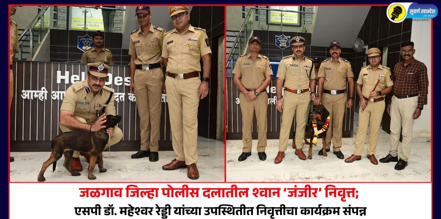 जळगाव, 4 ऑक्टोबर : जळगाव जिल्हा पोलीस दलातील श्वान पथकातील अत्यंत कुशल आणि शूर श्वान ‘जंजीर’ याची आज सन्मानपूर्वक निवृत्ती करण्यात आली. जंजीरच्या निवृत्ती समारंभाला जळगाव जिल्हा पोलीस अधीक्षक डॉ. महेश्वर रेड्डी, अप्पर पोलीस अधीक्षक अशोक नखाते, श्वान पथक प्रभारी अधिकारी पो. उपनिरीक्षक देविदास वाघ, तसेच पोहेकॉ निलेश झोपे, पोना प्रशांत कंकरे आणि पोहेकॉ संदीप परदेशी उपस्थित होते.