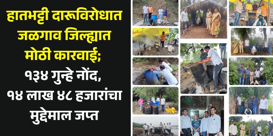 जळगाव, ११ जुलै : जळगाव जिल्ह्यात अवैध हातभट्टी दारूच्या विरोधात मोठी मोहीम राबवण्यात आली. शासनाच्या “शून्य सहनशीलता धोरणा”नुसार जिल्हाधिकारी आयुष प्रसाद यांच्या आदेशावरून आणि पोलिस अधीक्षक महेश्वर रेड्डी तसेच राज्य उत्पादन शुल्क अधीक्षक व्ही.टी. भुकन यांच्या मार्गदर्शनाखाली ही संयुक्त कारवाई करण्यात आली.