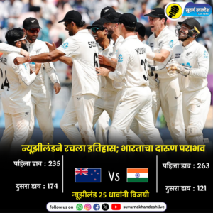 वानखेडे स्टेडियमवर खेळल्या गेलेल्या तिसऱ्या कसोटीत न्यूझीलंड संघाने टीम इंडियाचा 25 धावांनी पराभव करत मालिका 3-0 अशी जिंकली. एजाज पटेल आणि ग्लेन फिलिप्स यांच्या धोकादायक गोलंदाजीसमोर भारतीय फलंदाजांची दाणादाण उडाल्याने अवघ्या 121 धावांत संपूर्ण संघ गडगडला. दरम्यान, भारतीय संघाला 24 वर्षांनंतर घरच्या मैदानावर क्लीन स्वीप मिळाला असून भारतात पहिल्यांदाच न्यूझीलंड संघाने कसोटी मालिका जिंकली आहे.