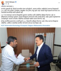 याबाबत माहिती देताना मंत्री गिरीश महाजन यांनी सांगितले की, माननीय मुख्यमंत्री श्री. देवेंद्रजी फडणवीस यांच्या मार्गदर्शनाने, आपल्या सर्वांच्या आशीर्वादाने जळगाव जिल्ह्यासाठी CIIIT (सेंटर फॉर इन्वेंशन, इनोव्हेशन, इंक्युबॅशन अँड ट्रेनिंग) मंजूर झाले आहे. यासाठी संपूर्ण सहकार्य करण्यास टाटा टेक्नॉलॉजी कंपनीनेही संमती दर्शवली आहे.